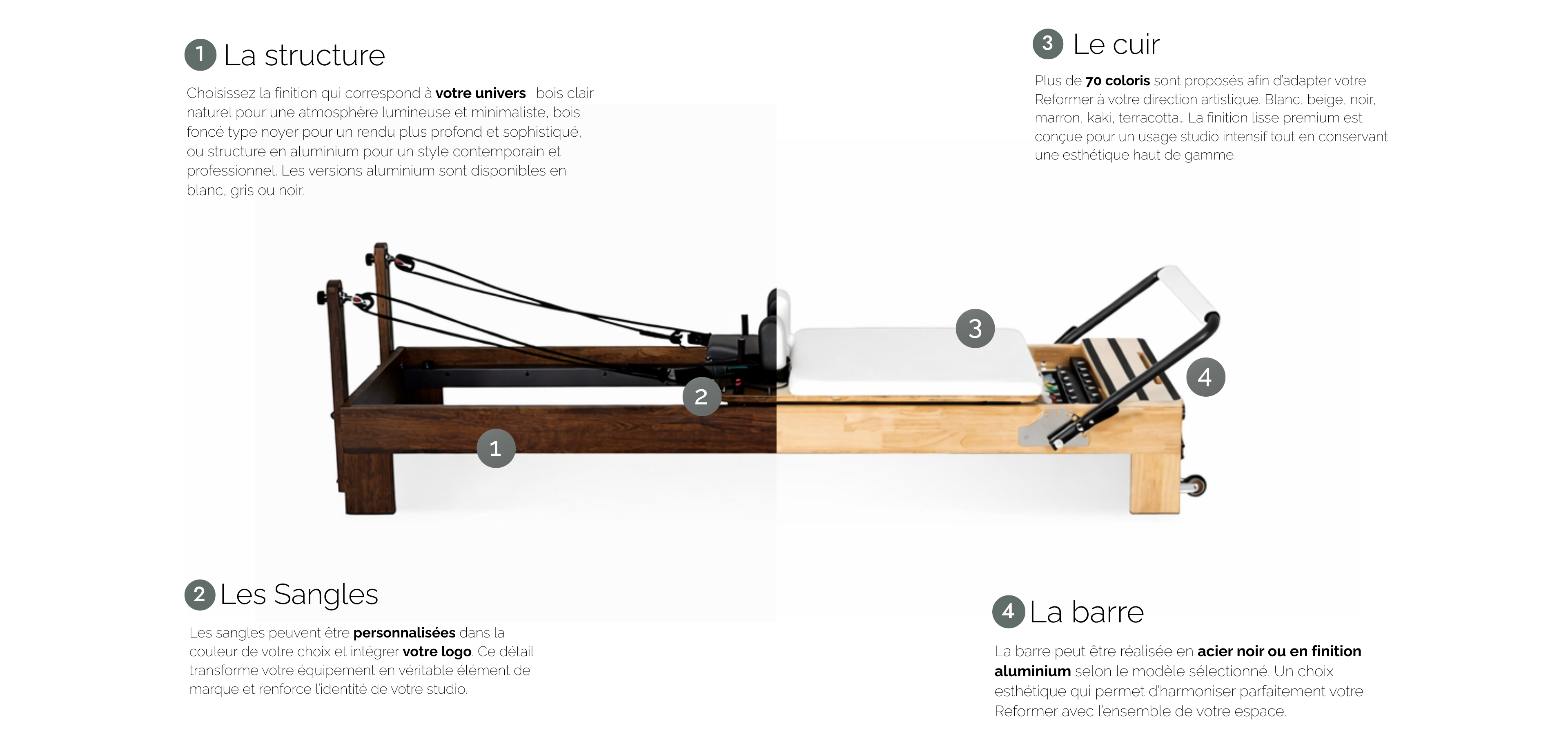 Reformer professionnel en chêne massif alliant robustesse, fluidité silencieuse et finitions premium.